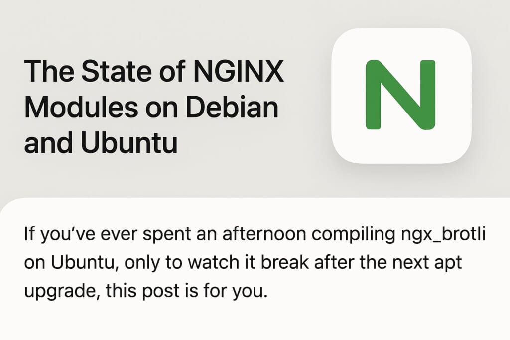 The state of NGINX modules on Debian and Ubuntu has become… let’s call it “challenging.” Ubuntu 22.04 LTS still ships NGINX 1.18 β€” that’s from April 2020. Meanwhile, the popular ondrej/nginx-mainline PPA that many relied on has officially deprecated its module packages. And Ubuntu itself? They’ve stopped accepting new third-party module requests entirely.