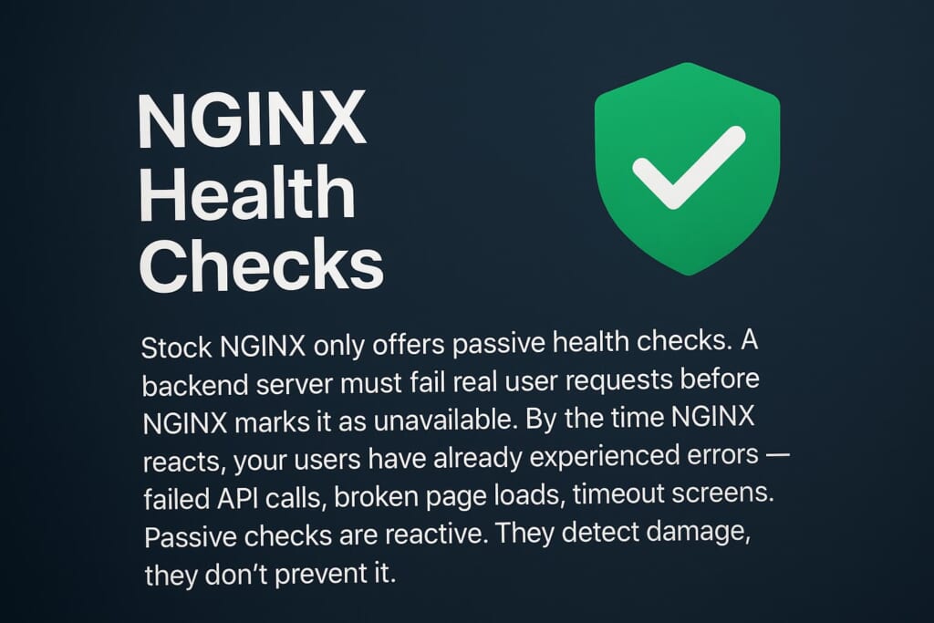 NGINX active health checks let you proactively monitor upstream servers by sending periodic probe requests — completely independent of client traffic. Stock NGINX only offers passive health checks, where a backend server must fail real user requests before NGINX marks it as unavailable. By the time NGINX reacts, your users have already experienced errors — failed API calls, broken page loads, timeout screens. Passive checks are reactive. They detect damage, they don’t prevent it.