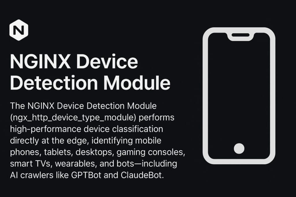 The NGINX Device Detection Module (ngx_http_device_type_module) performs high-performance device classification directly at the edge. It identifies mobile phones, tablets, desktops, gaming consoles, smart TVs, wearables, and botsβincluding AI crawlers like GPTBot and ClaudeBot.
