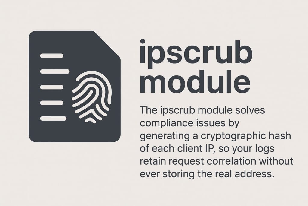 The ipscrub module eliminates this problem. It replaces every IP address with an irreversible cryptographic hash — right inside NGINX, before anything hits the disk. Requests from the same visitor still produce the same hash within a configurable time window, so you keep full traffic correlation. But the actual IP address is never stored. One module, one line of configuration, and your access logs are no longer personal data.