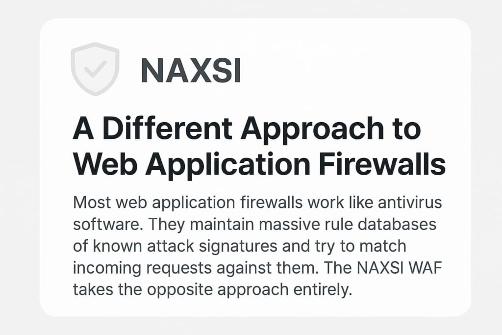 Most web application firewalls work like antivirus software. They maintain massive rule databases of known attack signatures and try to match incoming requests against them. The NAXSI WAF takes the opposite approach entirely.