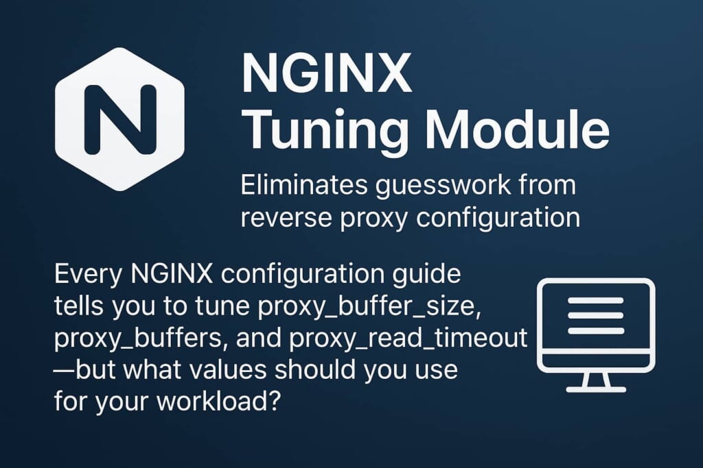The NGINX tuning module eliminates guesswork from reverse proxy configuration. Every NGINX configuration guide tells you to tune proxy_buffer_size, proxy_buffers, and proxy_read_timeout—but what values should you use for your workload?